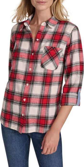 Women Button Front Long Roll Tab Shirt